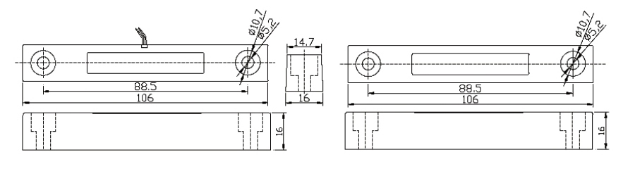 4)、在安裝過程中,表面貼裝時干簧管的觸點位置與磁鐵的磁力線最高點一定要平行安裝;但在嵌入式暗裝時,磁鐵和干簧管兩部份要相向平行在一條線上,這樣才可以取得最佳的感應距離。且兩部份最好無間隙安裝,間距越小越好,最大間隙不應超過5mm(卷簾門除外)。如果錯位安裝將導致啟動感應距離的縮短,甚至感應不到任何信號的時候,就會導至開關失靈。